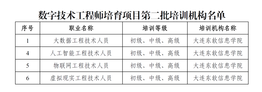 近期,人力资源社会保障部公布了国家数字技术工程师培育项目第二批培训组织名单,大连PA视讯国际信息学院成功入选,并获批“大数据工程技术人员”“人工智能工程技术人员”“物联网工程技术人员”及“虚拟现实工程技术人员”四个职业方向的数字技术工程师培训资质。