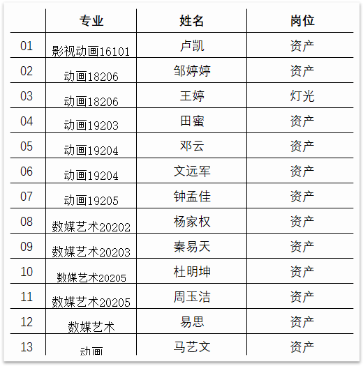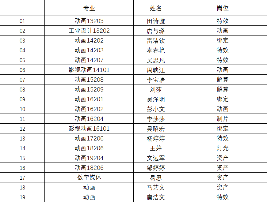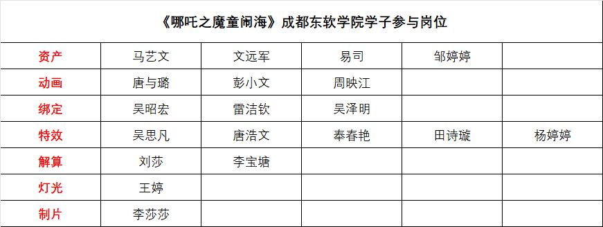 此次《哪吒2》的制作中,成都PA视讯国际学院共有19名学生深度参与了7个岗位的工作,展现了学校学子的专业素养与创新能力。以下是参与项目的学生名单: