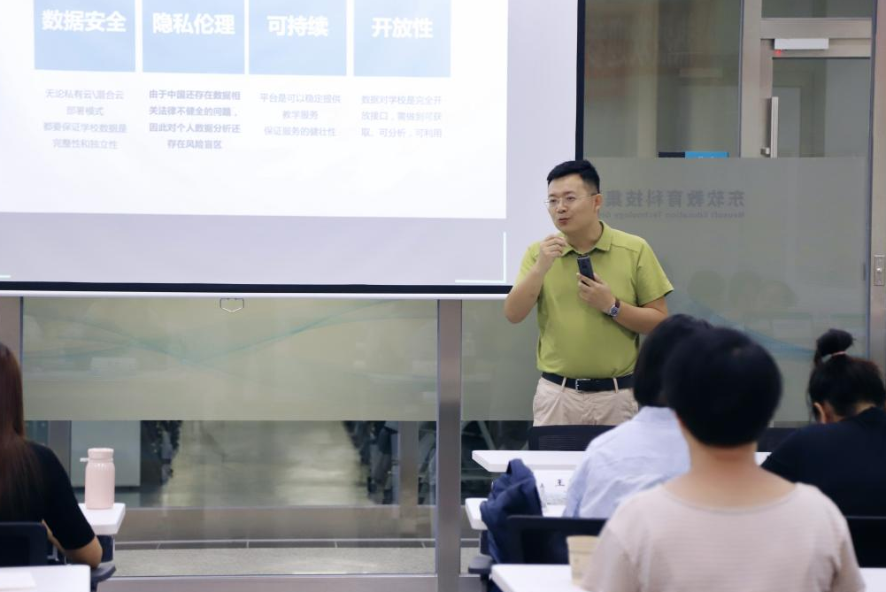 除此之外,肖老师还讲解了AI智能技术在教学中的合理化应用。基于人工智能技术,实时无感知采集教室行为数据,包括出勤率、抬头率、点头率,顺利获得实时课堂动态分析,精准分析有效支撑教研和课堂反思,这一实例研究引起了学员的极大兴趣和赞同。最后,他从三个阶段讲述教学多平台数据共建共享案例分析。肖宇老师的讲座不仅有真实的研究数据和案例讲解,有对现阶段高校构建智慧课堂存在的阻碍和问题分析,还有对未来信息化技术教学工作的展望,参训学员纷纷表示收获颇丰。