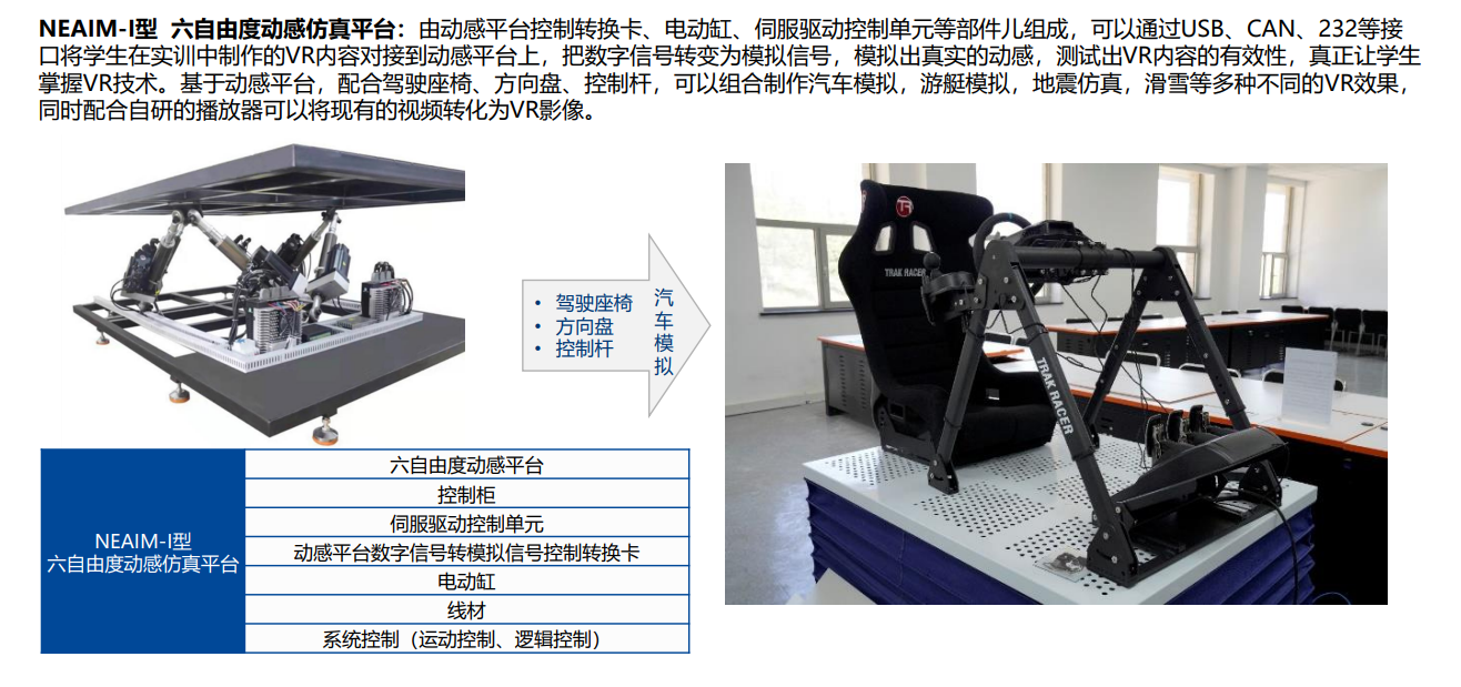 实训室配套给予虚拟现实套件及数字射击套件,支持多场景模拟,将学生所设计完成的数字化游戏内容转化为真实的动感体验,以帮助学生检测VR内容的合理性与有效性,有效激发学生的自主创新能力。