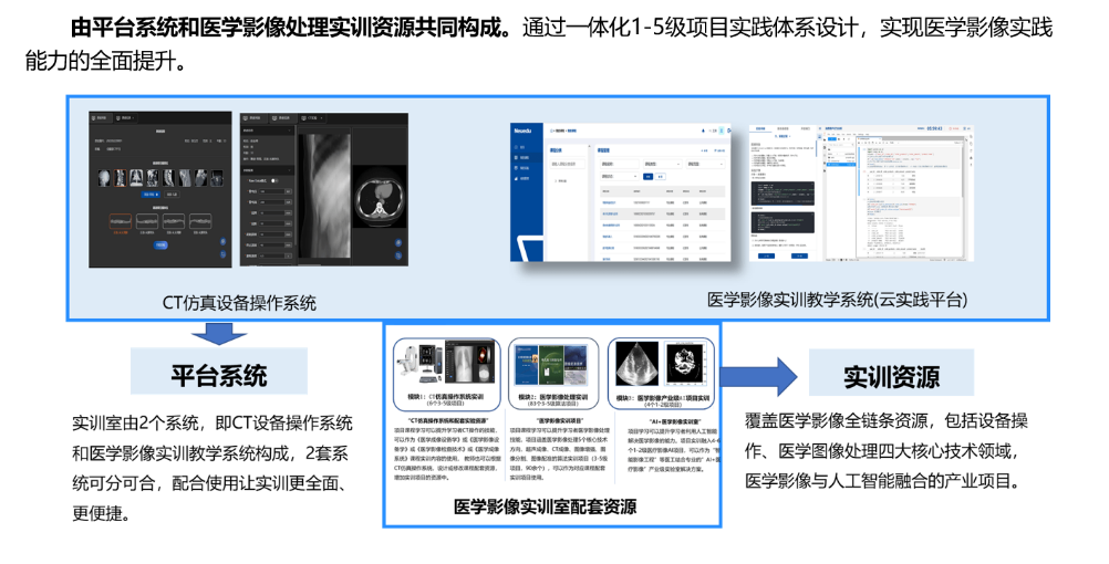 针对医学影像相关岗位的共性需求,基于医院里真实医疗影像设备对应的操作系统,从医学影像系统使用和影像处理两个维度,研发了三类项目实训,分别为CT 仿真操作系统实训、医学影像处理实训、医学影像产业级 AI 项目实训。