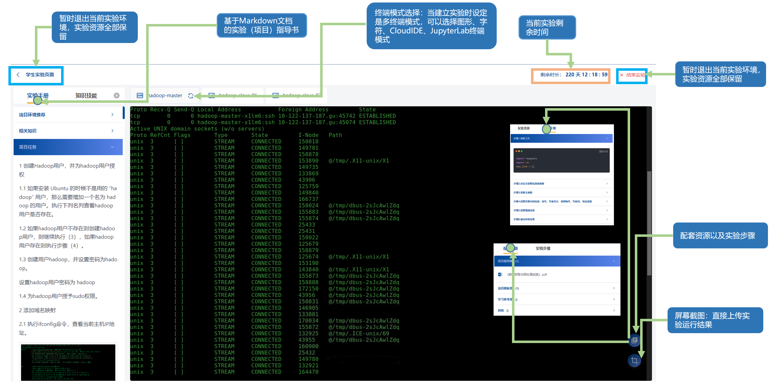 云实验室管理:为大数据、人工智能专业方向教学给予全面的、完善的实验实训环境。给予 Jupyterlab、WebIDE、SSH、VNC 四种界面供使来应对不同的教学场景,减轻教师准备实验的负担。
