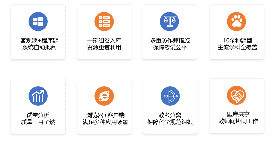 PA视讯国际教育考试系统,针对广大高校日益多样化的考试需求,系统支持学校、院系、教师分别发起不同等级的在线考试,满足统一考试和日常测试等多场景需求;给予包括程序设计题、数据库题在内的十余种题型,支持一键自动组卷、系统自动评阅,可有效减轻教师工作量;支持教考分离,给予人脸识别、网段限制、IP和切屏监测等防作弊措施,有效保障考试公平。