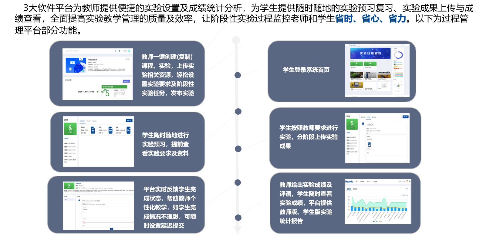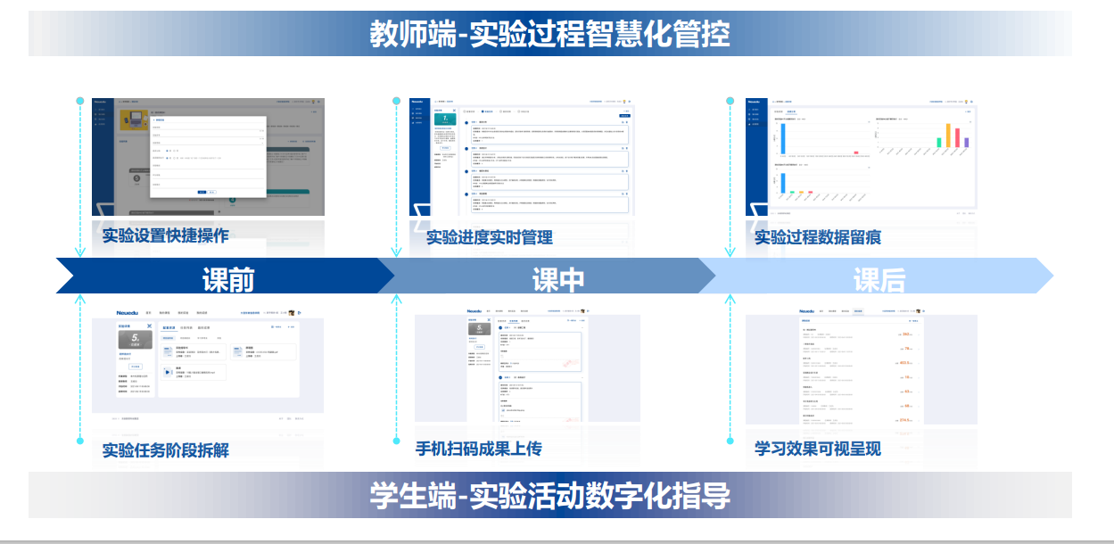 实验过程管理:为教师给予便捷的实验设置、阶段性实验过程监控及成绩统计分析,为学生给予随时随地实验预习复习、实验成果上传与成绩查看,全面提高实验教学管理的质量及效率。