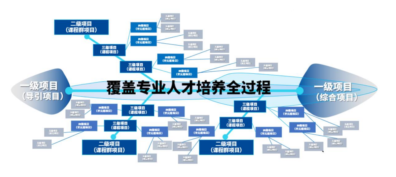 以能力为导向以项目为牵引打造一体化实践教学体系。根据真实生产、服务的技术和流程,对各专业课程体系结构、内容和次序进行重新设计,构建了能力导向、五级项目牵引、内容动态更新的一体化实践教学体系,实现: