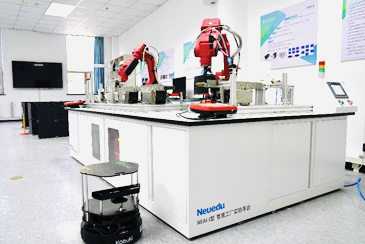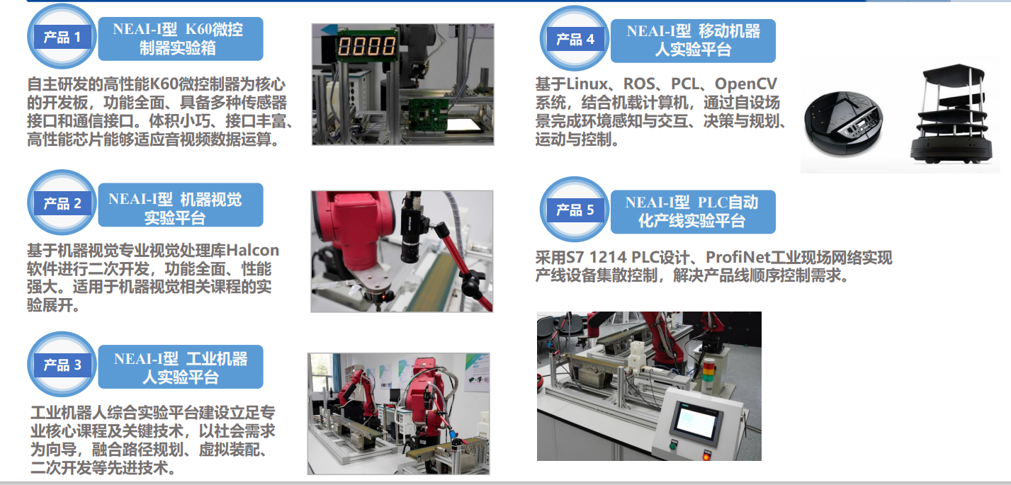 该实训室围绕前沿智能制造领域“智慧工厂”的典型场景,研发搭建微控制器实验平台、机器视觉实验平台、工业机器人实验平台、智能移动机器人实验平台以及自动化产线实验平台共五大硬件实验平台。