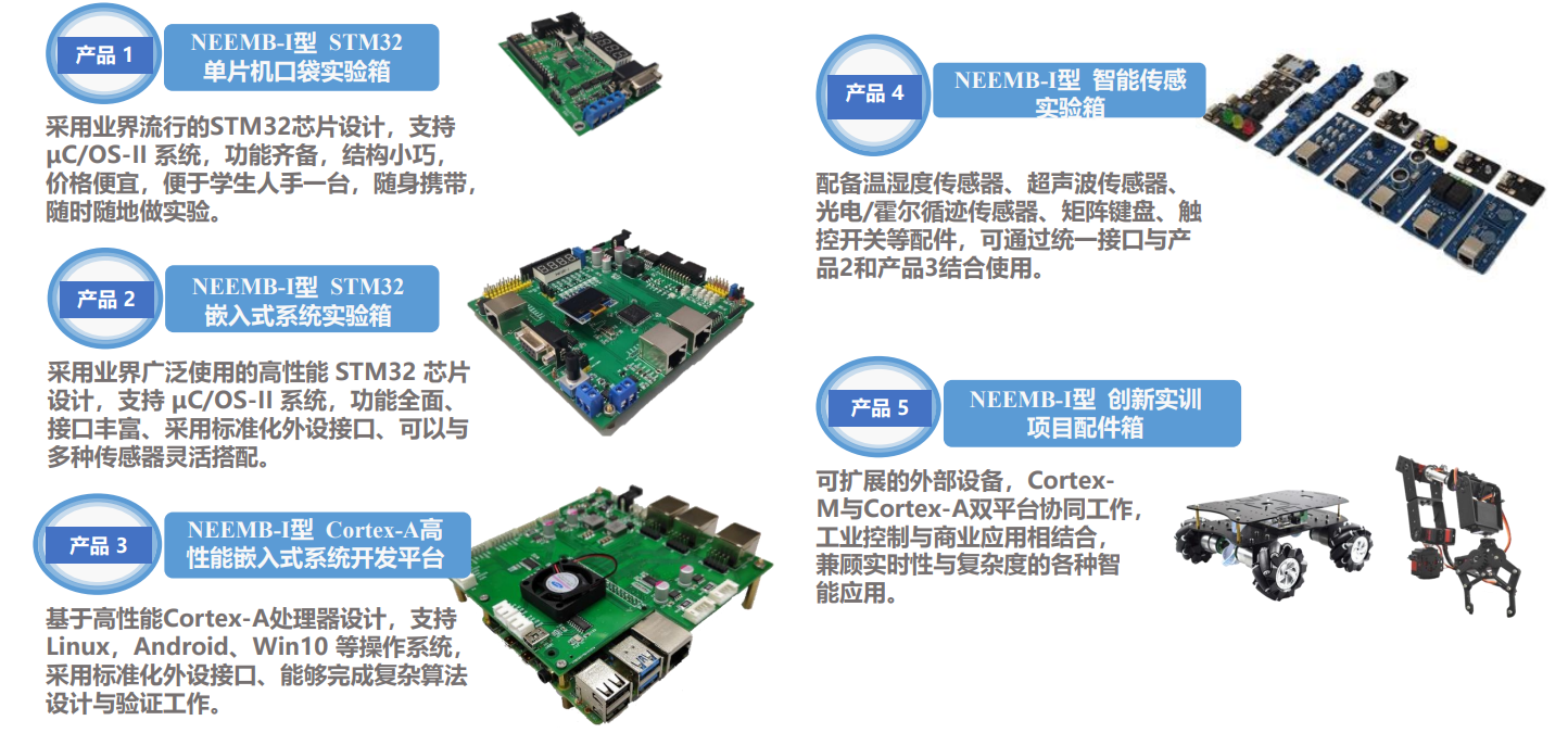 实训室依托自主研发的STM32单片机口袋实验箱、STM32嵌入式系统实验箱、Cortex-A高性能嵌入式系统开发平台、智能传感实验箱以及创新实训项目配件箱等硬件实验平台,顺利获得核心课程及进阶式项目,实现覆盖嵌入式系统的认知、微控制器应用、智能传感与检测、人机交互系统开发、数据采集控制系统、多机通讯系统、嵌入式系统软硬件综合设计的全景能力培养与演练。