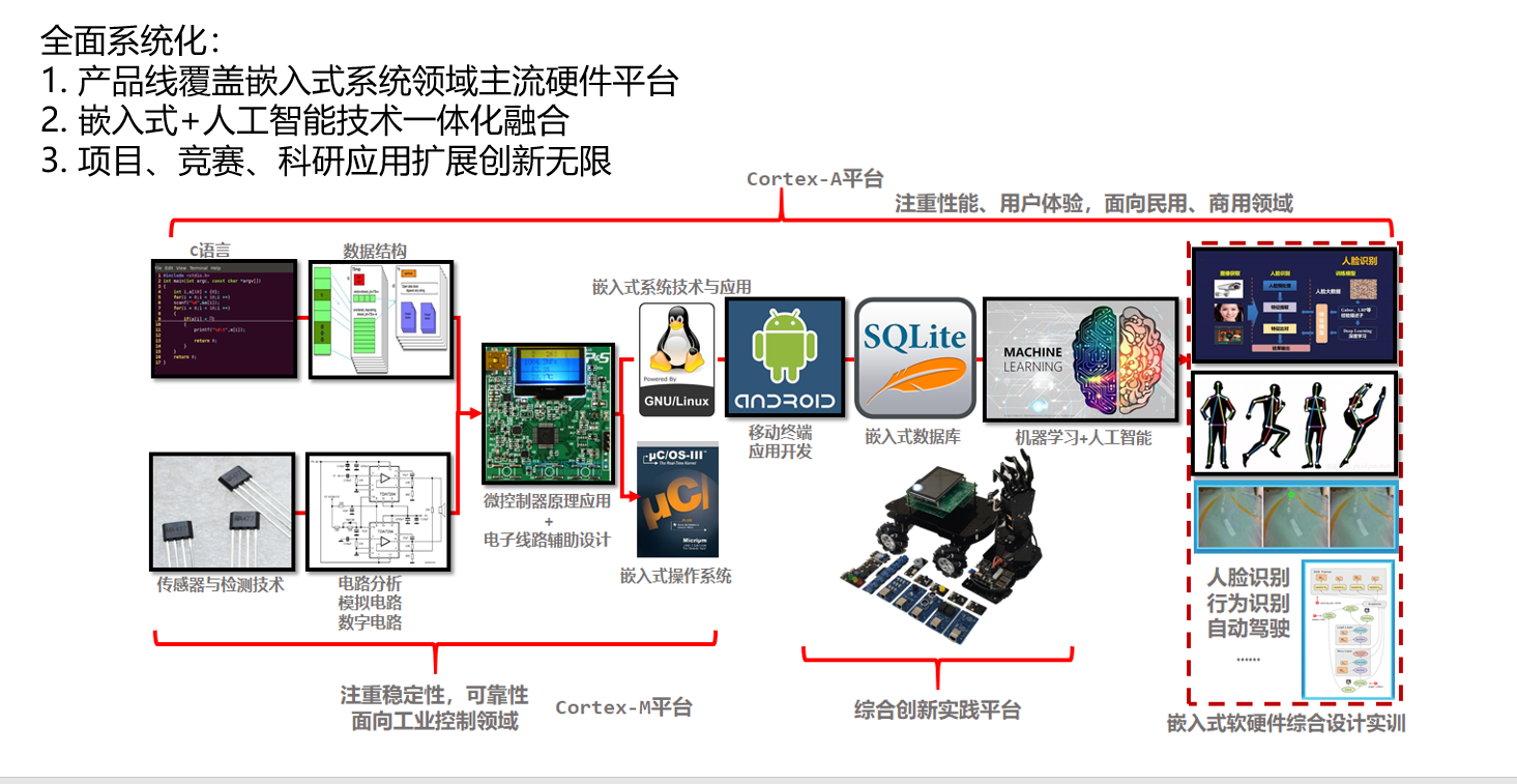 实验设备覆盖嵌入式系统领域主流硬件平台,项目设计中将嵌入式技术与人工智能技术进行一体化融合,实验配件有效支撑各级实验项目的开放性与创新性,完成实验教学的同时还可以满足竞赛和科研等创新应用的需求。