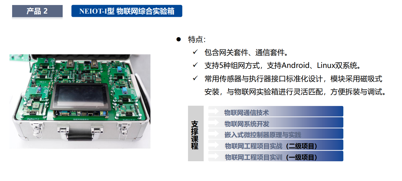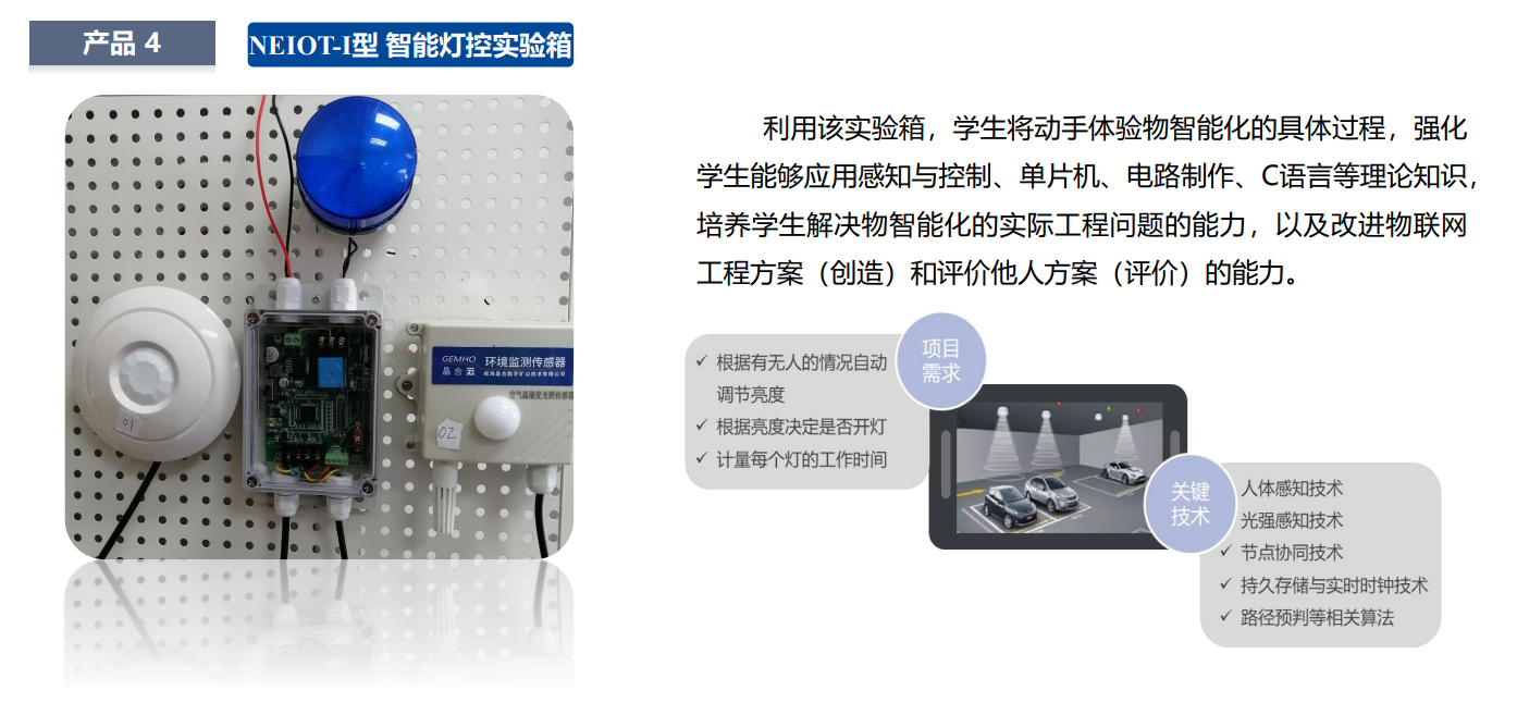 项目进阶实践体系设计研发了与实践项目相配套的物智能化实验箱、物联网综合实验箱、智能灯控实验箱以及智能停车场实验平台,实现学生从物联网系统认知、物智能化、物接入网络到物联应用的能力进阶过程。