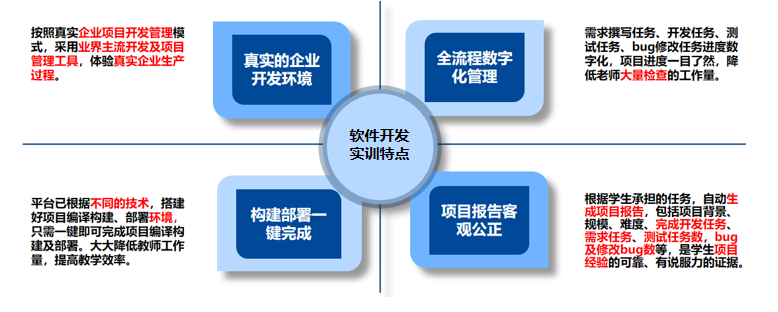实训室项目基于企业项目开发管理模式,配套给予业界主流开发环境及项目管理工具,按照“项目启动、需求分析、系统设计、代码实现、系统测试、项目总结”的软件开发流程,帮助学生充分掌握行业主流软件开发技术及开发工具,分析企业真实项目开发流程,熟悉企业编码规范,并培养起良好的协作意识与职业素养。