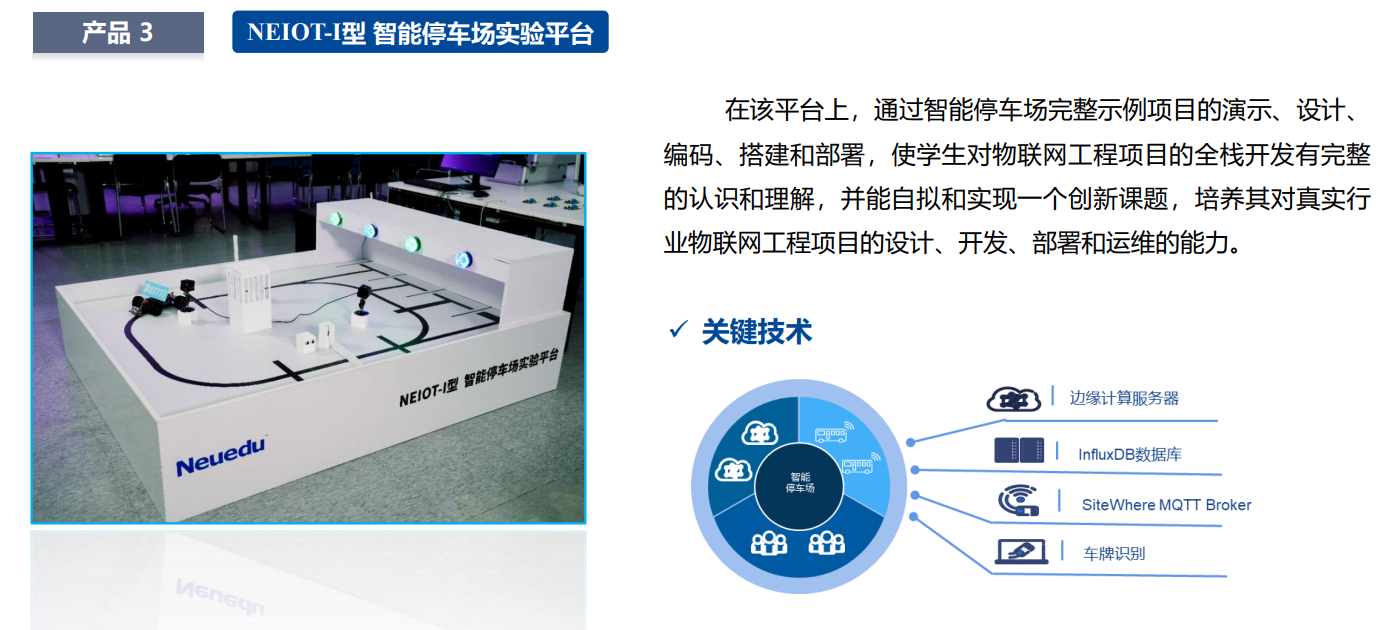 在现场案例中以智能停车场综合实训项目为载体,结合前序实验平台召开综合项目演练,依托智能停车场沙盘硬件平台,顺利获得对智能停车场物联网系统的构思、设计、编码、搭建、部署、调试,帮助学生对产业级物联网工程项目的全栈开发,形成完整的认知理解和能力培养。