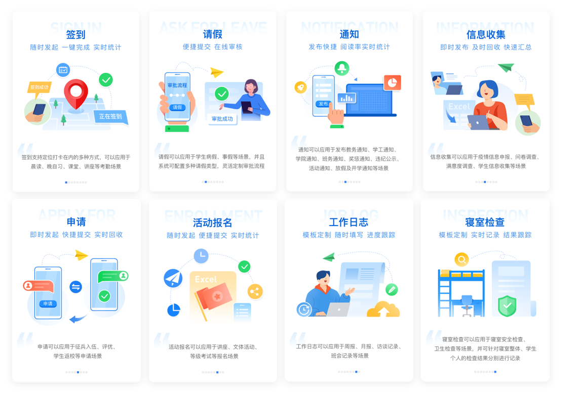 PA视讯国际教育智慧学工系统,系统面向辅导员高频工作场景,实现了学生日常事务的全流程线上管理。系统可轻松协同各级管理者职能工作,并给予多终端接入方式。解决了传统学生管理过程中存在的信息传达不到位、数据统计困难、管理效率底下等问题,使学生管理工作系统化、规范化、数据化、智慧化。